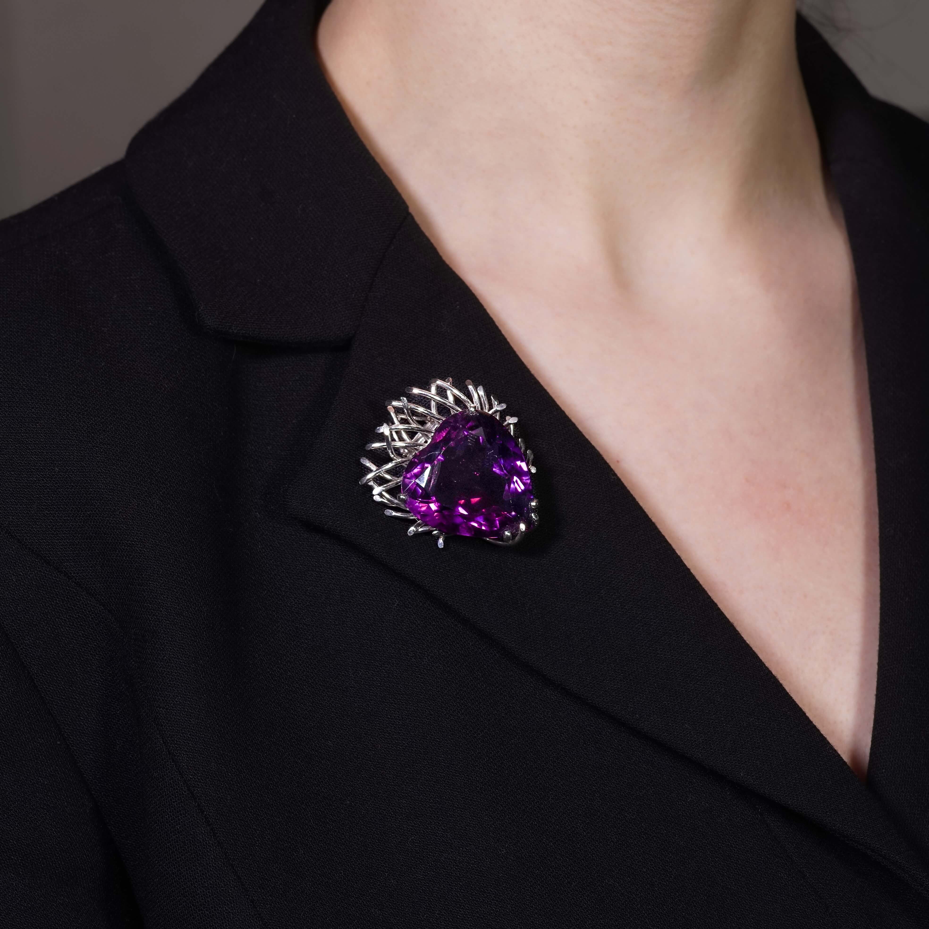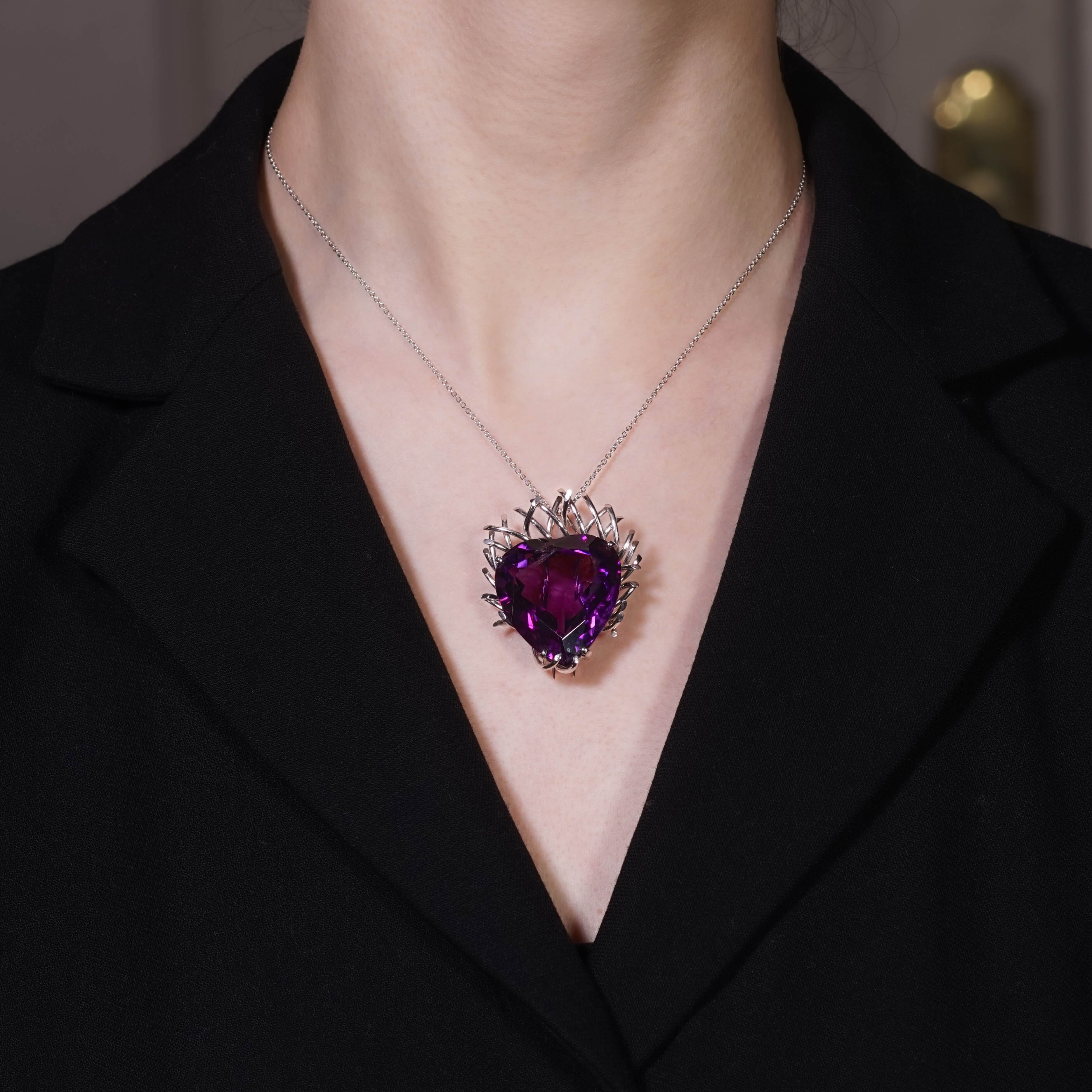 An attractive vintage amethyst pendant brooch, mounted with a large deep purple heart shaped amethyst weighing an imposing 58 carats. The stylised abstract setting is hand crafted in 18 carat white gold and is dating to circa 1970.