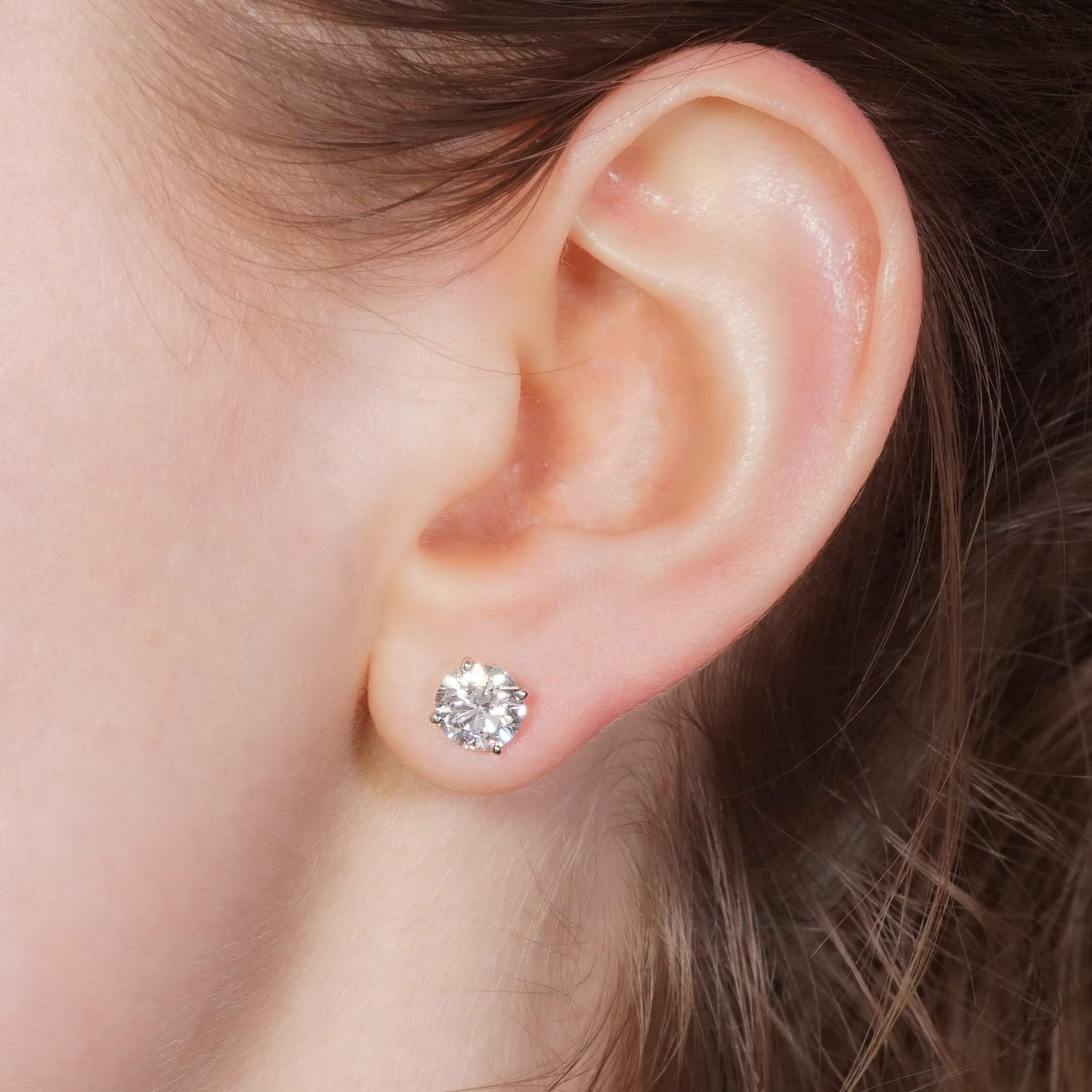 A pair of exceptional brilliant cut diamond stud earrings. One diamond weighing 1.20 carats and the other weighing 1.22 carats, both accompanied with certificates published by the Gemmological Institute of America (The G.I.A). Both of these stunning diamonds are extremely well matched and display an E in colour with VS2 clarity. Mounted in fine four claw platinum settings.