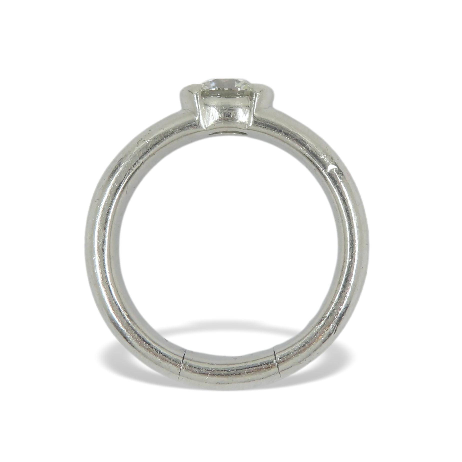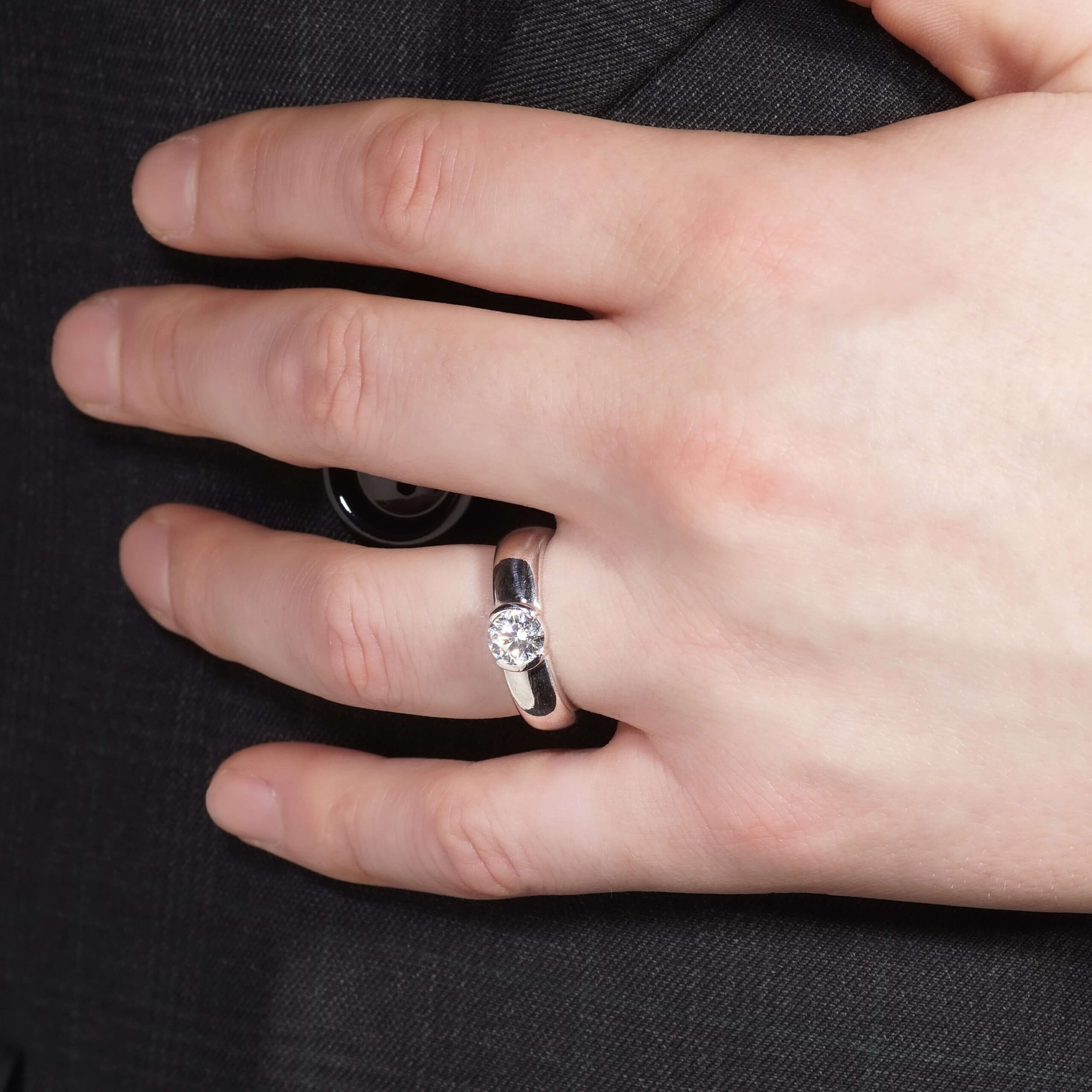 A diamond solitaire band ring by Tiffany & Co. Featuring a 1.09 carat round brilliant cut diamond, stylishly mounted to a wide polished band within a partial collet setting. Hand crafted throughout in platinum.