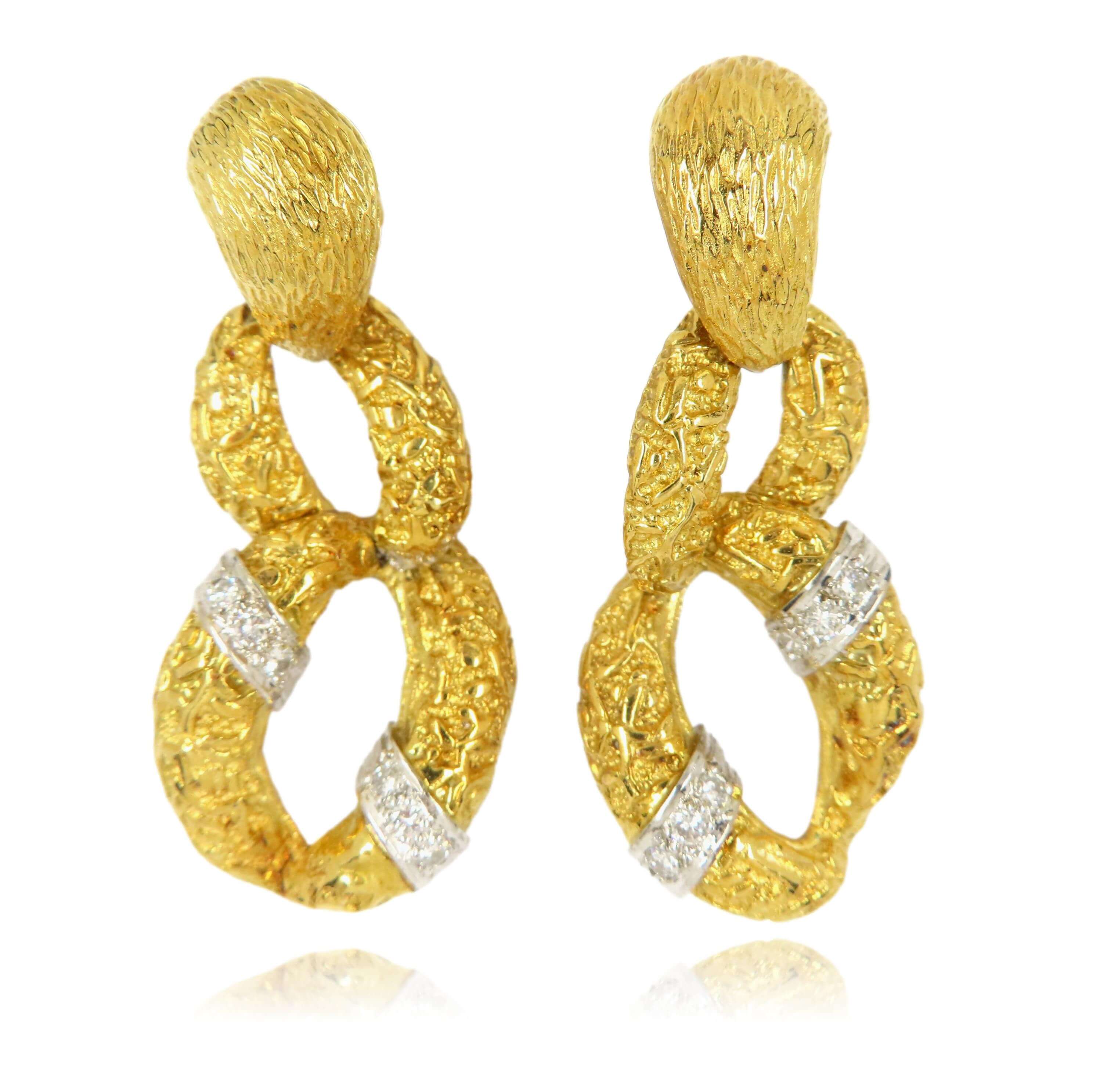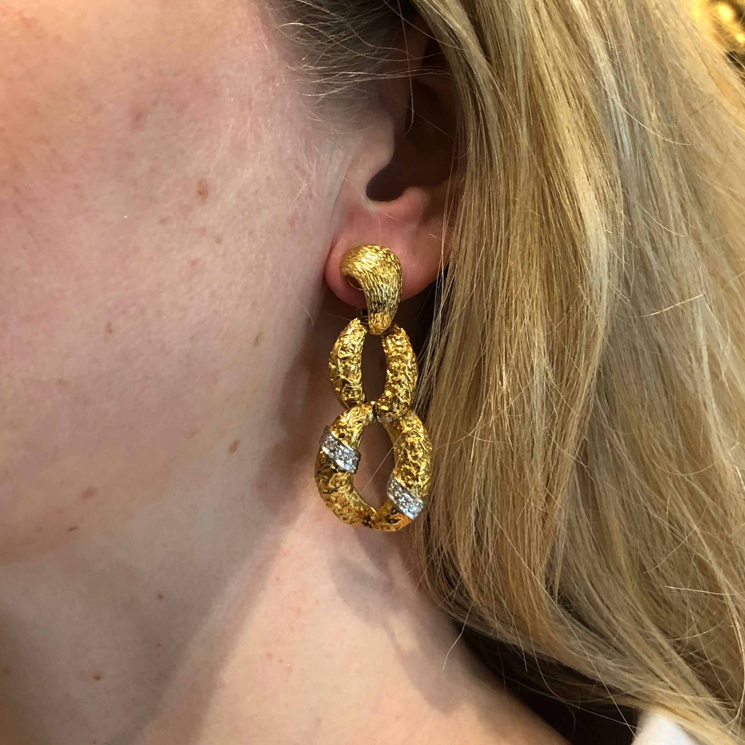 A beautiful and stylish vintage pair of textured diamond set long drop earrings by Ben Rosenfield of London. Mounted with round brilliant cut diamonds, arranged in artistic, stylised ribbon clusters textured curb motifs graduating up in size and suspended from textured clip fittings. The round brilliant cut diamonds are estimated to weigh a total of 0.50 carats. Hand crafted throughout in 18 carat yellow gold and platinum and hallmarked for London 1979.