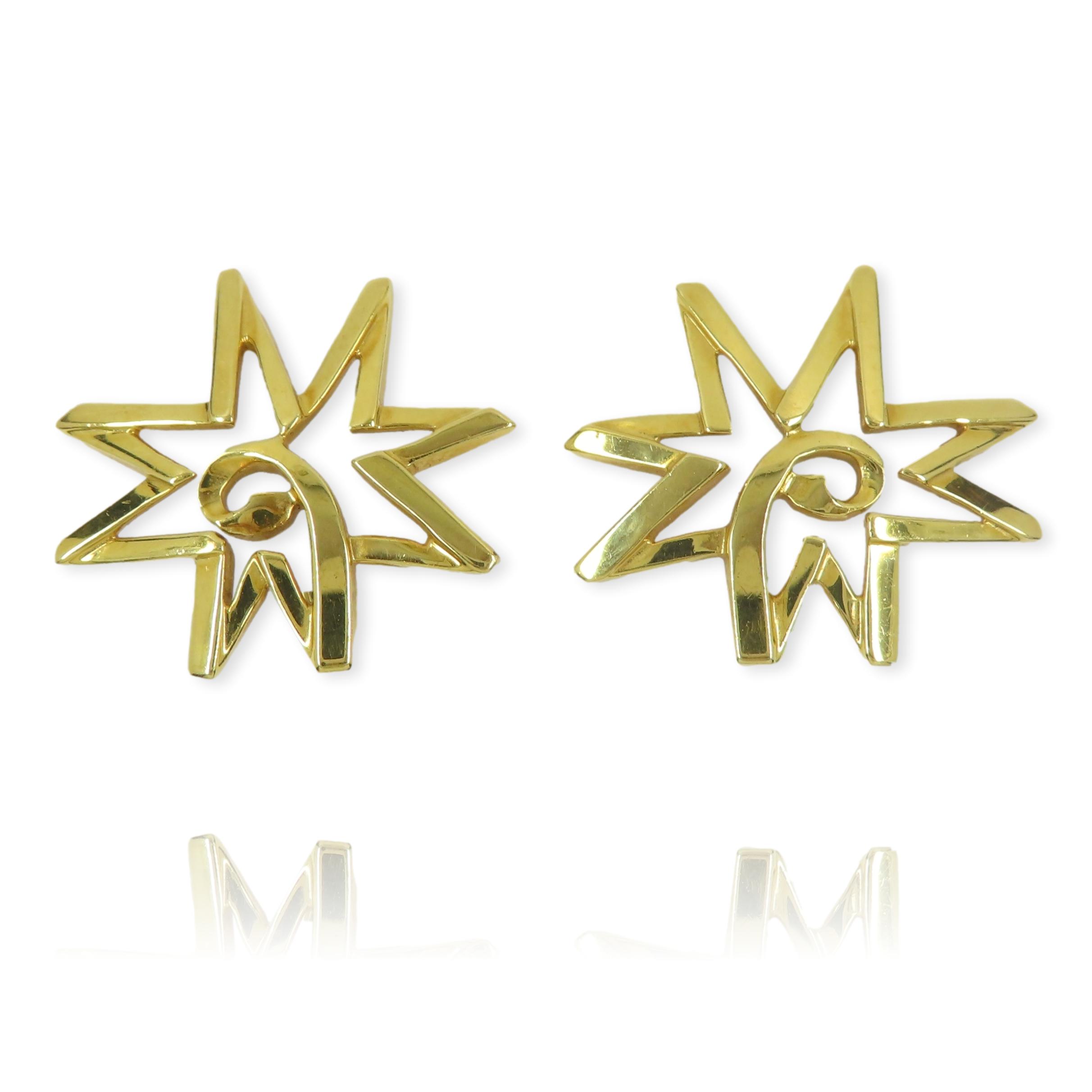 A stylish pair of abstract clip earrings by Paloma Picasso for Tiffany & Co. Each formed of an abstract folding star motif with a spiral to its centre. A distinctively bold design by the iconic twentieth century designer Paloma Picasso, the daughter of Pablo Picasso and Francoise Gilot, for Tiffany & Co. Hand crafted throughout in 18 carat yellow gold, and fitted with clip fastenings and dating to circa 1990.