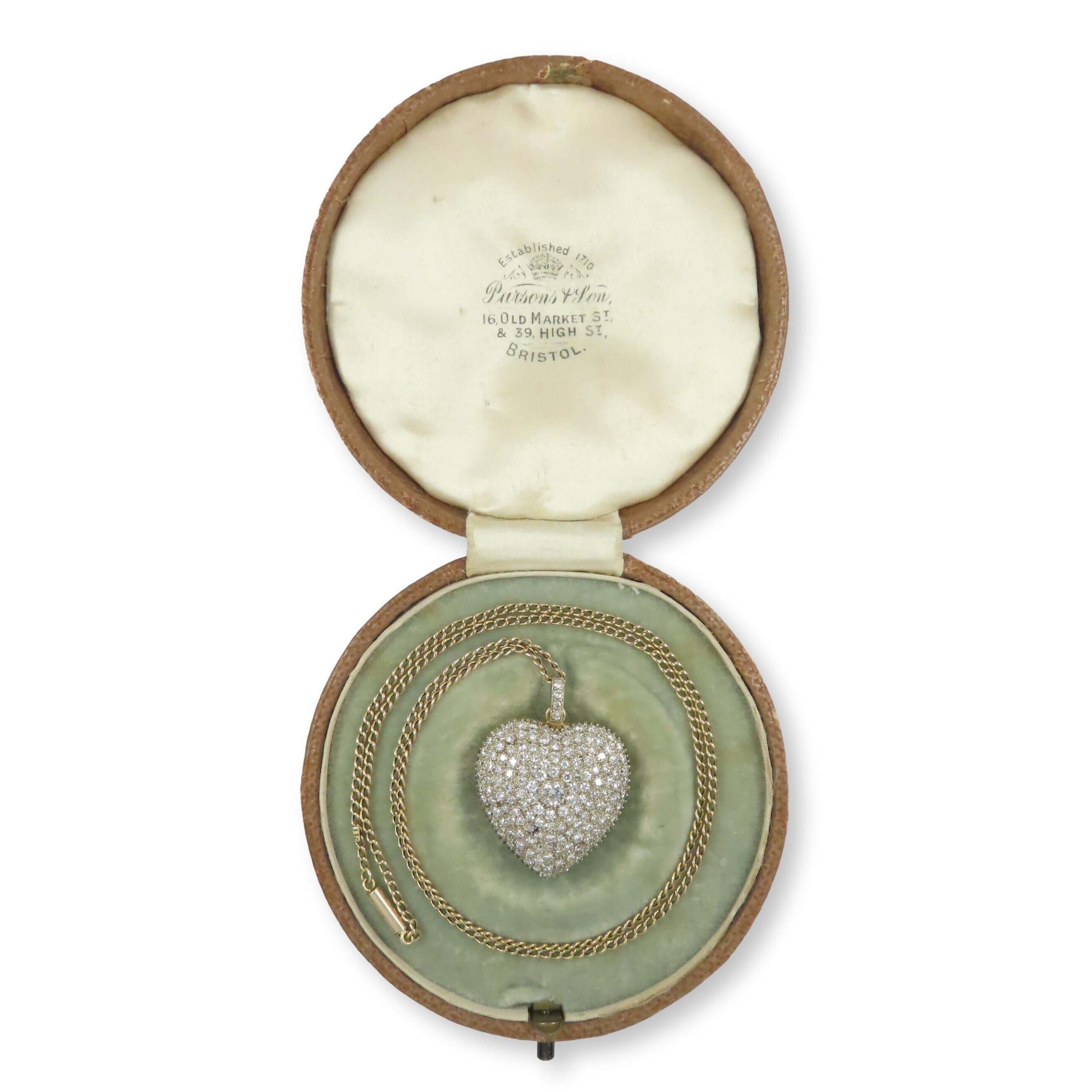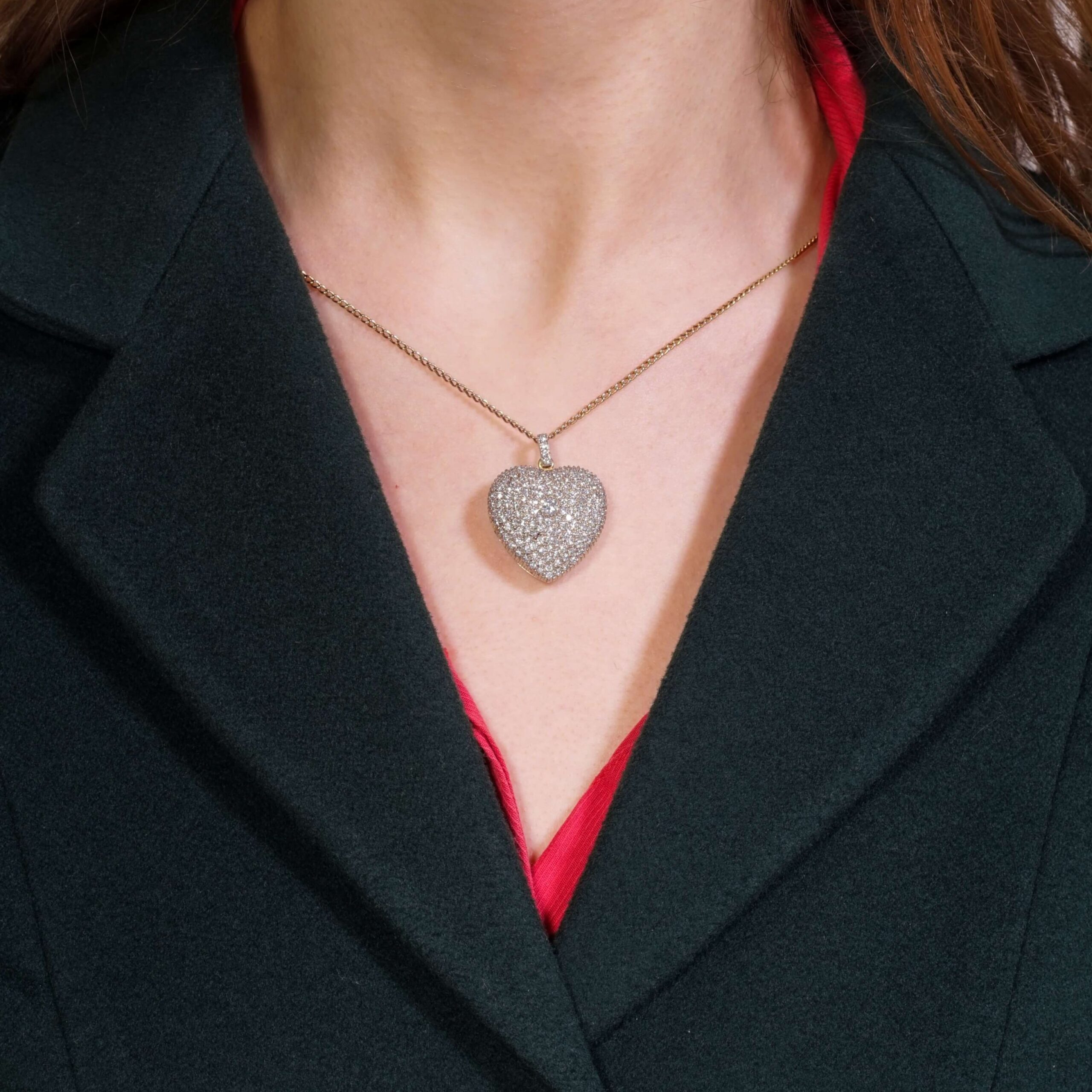 A vintage diamond set heart locket pendant. Beautifully mounted to the domed heart shaped surface with over one hundred and fifty round brilliant cut diamonds, estimated to weigh a total of three carats combined. Featuring a heart shaped rock crystal vitrine to the reverse, forming a window into the locket compartment. Suspended from a diamond set pendant loop and an antique 15 carat gold trace chain with a barrel clasp. Hand crafted throughout in 18 carat yellow gold and dating to circa 1950.