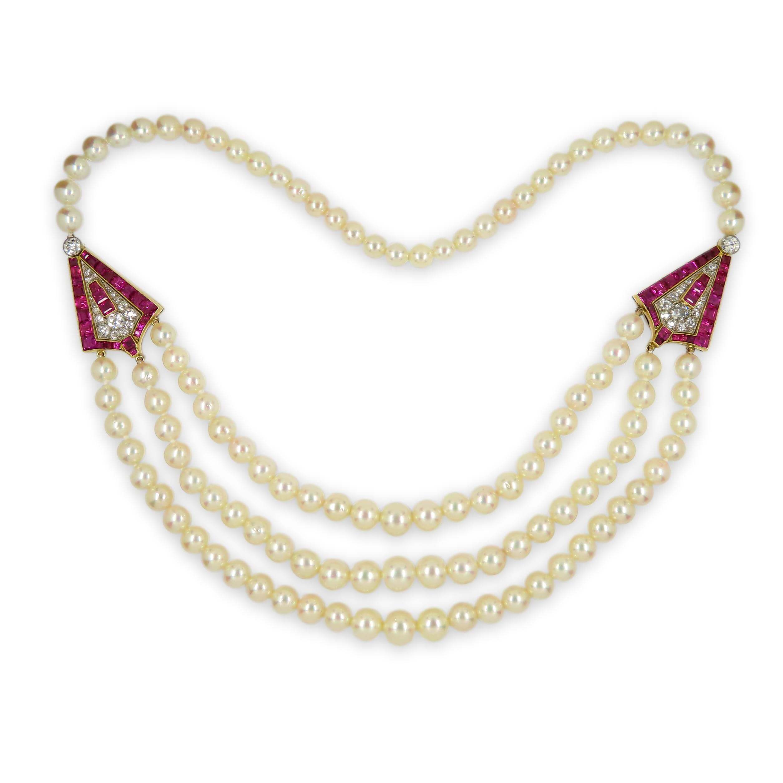 A stunning vintage Art Deco ruby and diamond cultured pearl triple strand necklace. Formed of two shield shaped ruby and diamond plaques, strung to either side, suspending a trilogy of silver cream cultured pearl strands. The two plaques are mounted with an important collection of square shaped ‘pigeon blood’ red rubies, accompanied by a certificate confirming the rubies are all natural and untreated material of Burmese origin. The rubies are estimated to weigh a combined total weight of eight carats. Further mounted with approximately three carats of antique round brilliant cut diamonds. The necklace is strung with over one hundred beautifully matched cultured saltwater pearls. Wonderfully hand crafted in rich 18 carat yellow gold and platinum and dating to circa 1930.