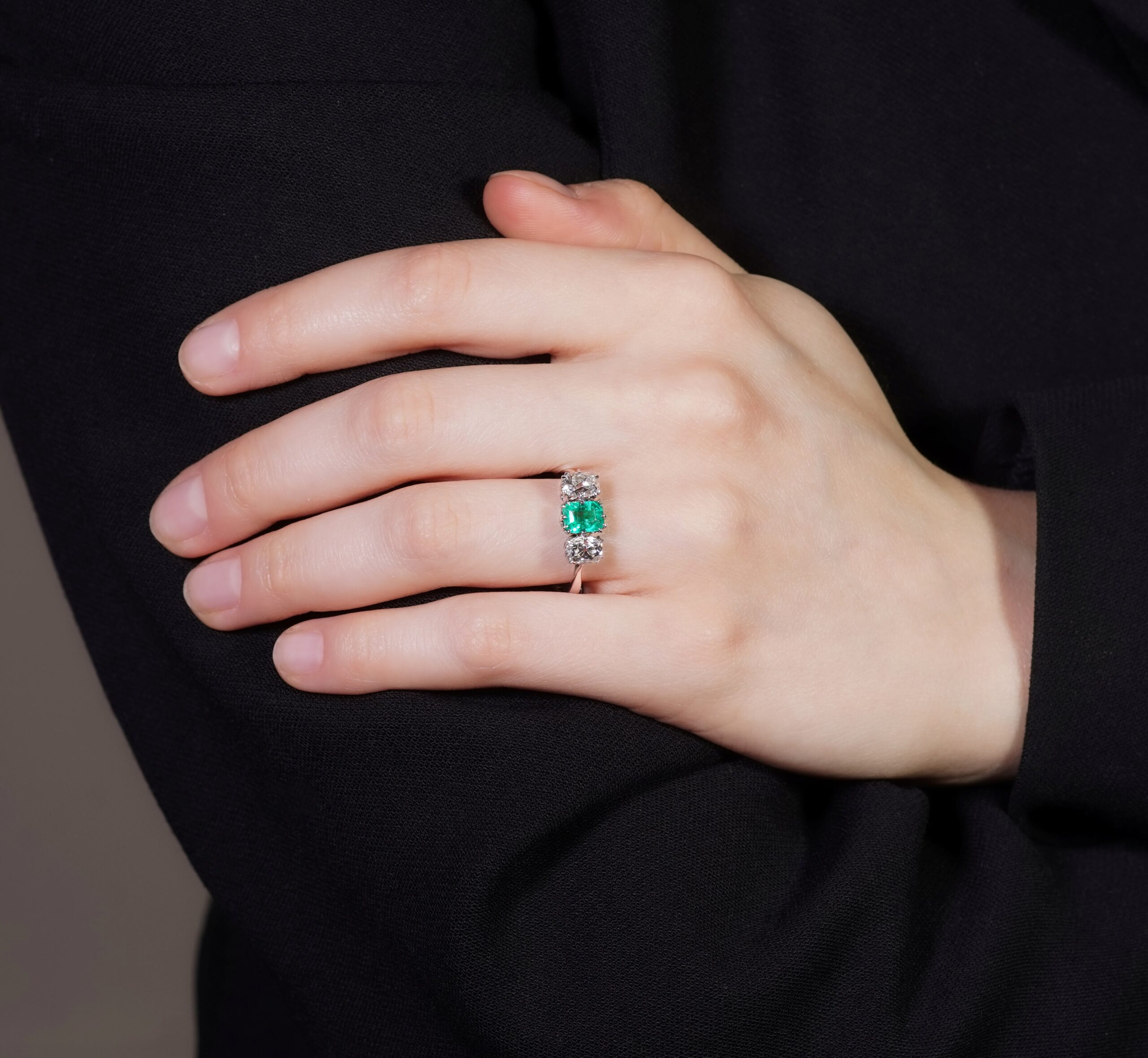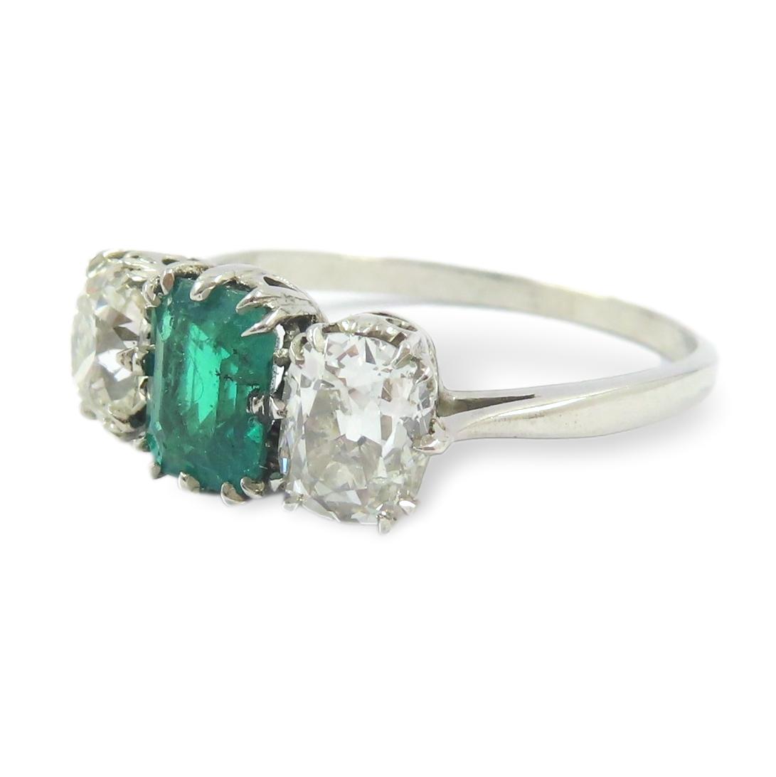 An antique Edwardian certificated Colombian emerald and diamond three stone ring. Mounted to the centre with a certificated vivid green Colombian emerald cut emerald, weighing approximately 0.80 carats. further mounted with a pair of antique elongated oval cushion cut diamonds, weighing approximately 0.80 carats each. Expertly hand crafted throughout in platinum, and dating to circa 1910.