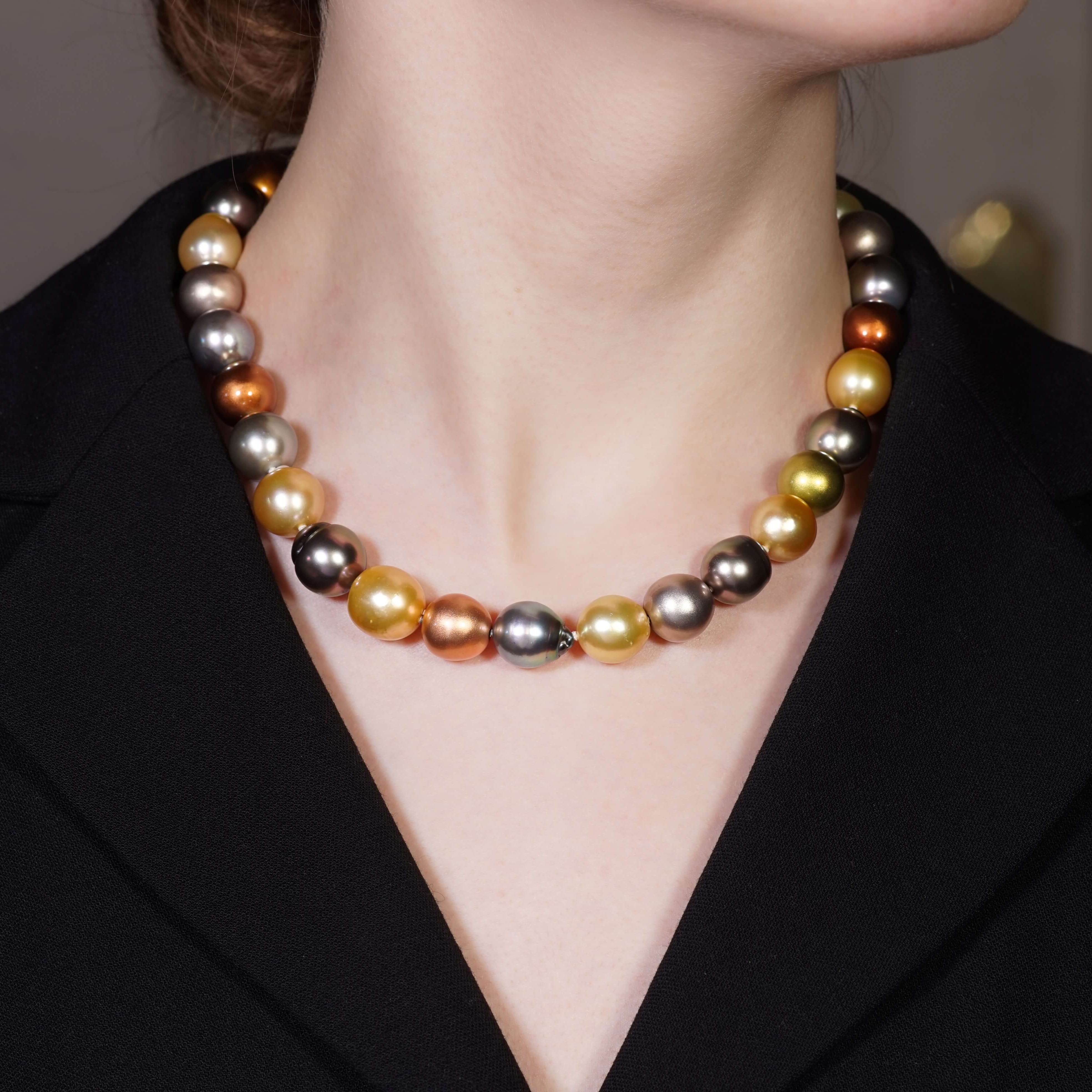 A stylish vintage Tahitian cultured saltwater South Sea pearl necklace. Strung with a beautiful collection of multicoloured South Sea pearls with intense black, green, grey, gold and cream hues with a stunning iridescence. The necklace is strung with a gentle graduation and the pearls are measuring 12 mm to 15 mm in diameter, alternating with ten coloured beads of varying golden coloured hues. The necklace measures 17.5 inches in length and is fitted with a concealed push clasp fastening, concealed within a cultured pearl to the reverse.