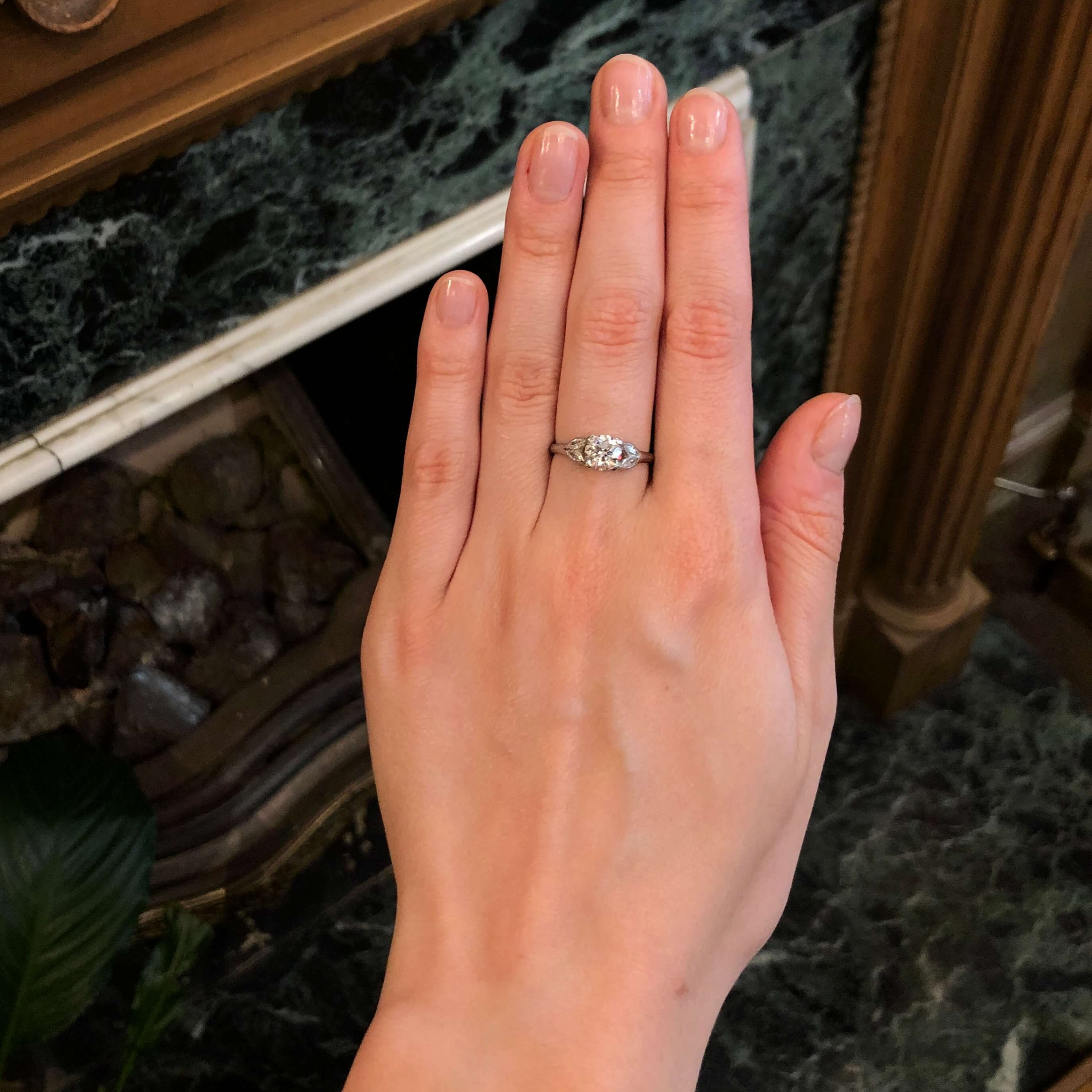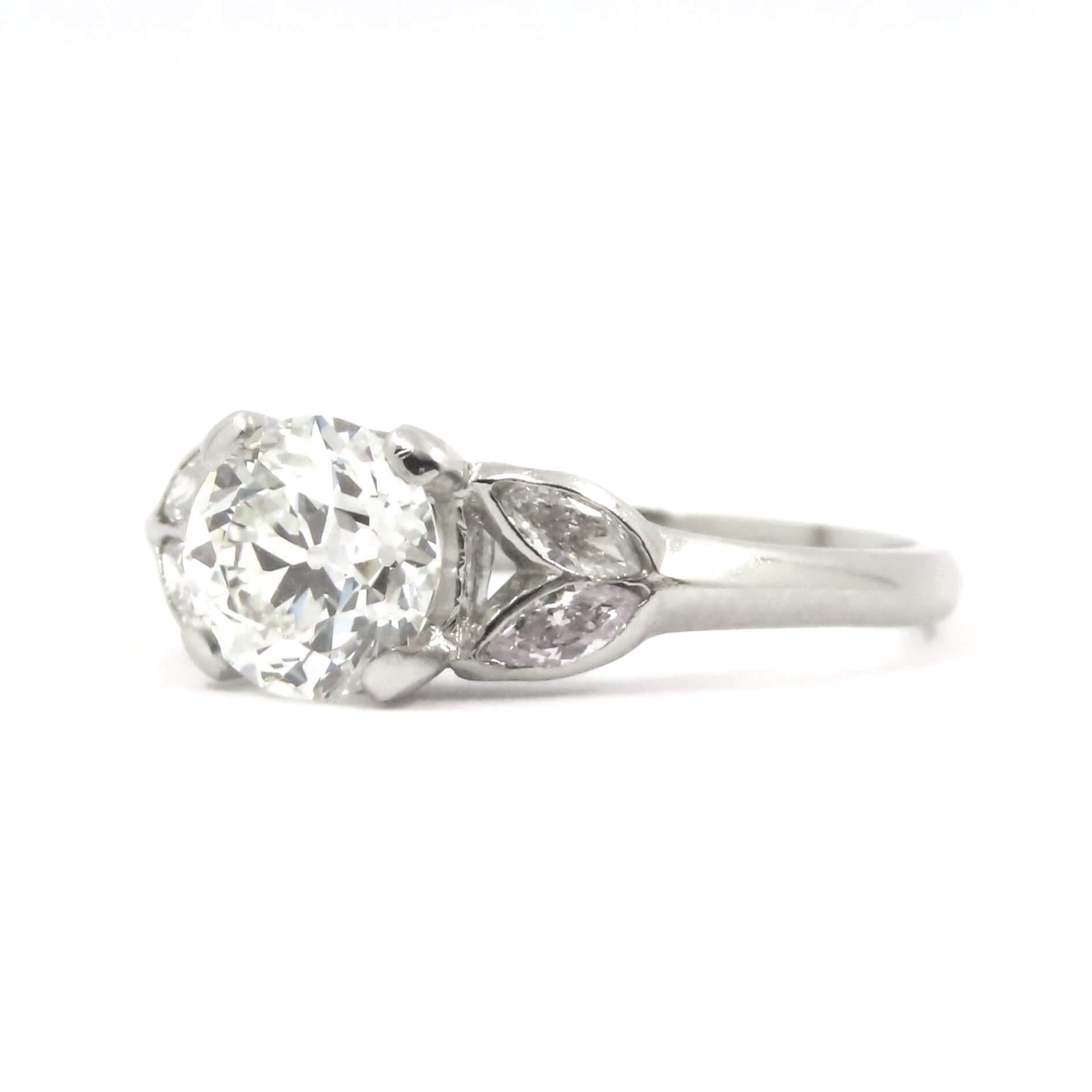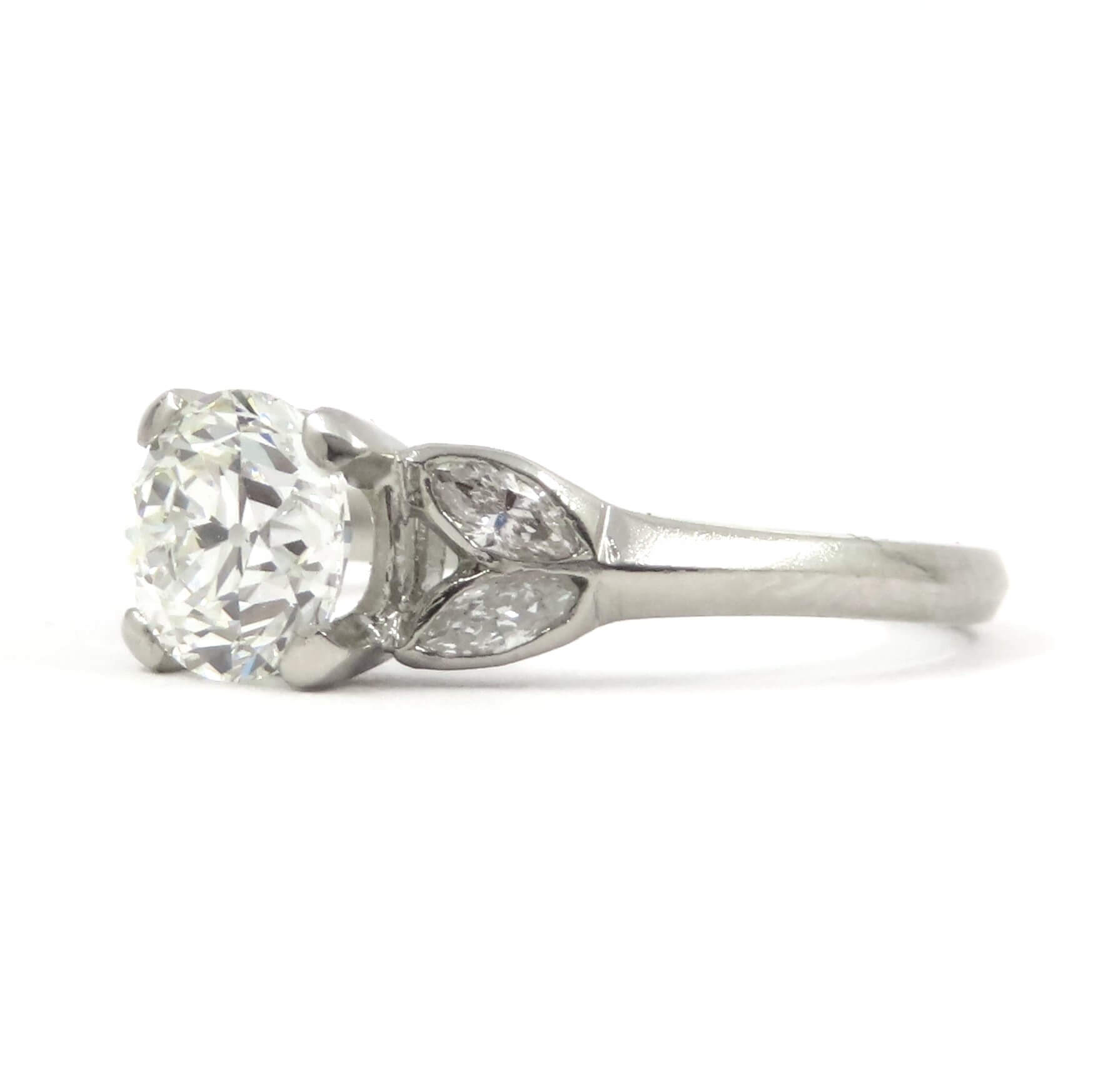 A stunning solitaire diamond ring with diamond set shoulders. The principal certificated antique brilliant cut diamond weighs 1.01 carats and displays an H in colour. Mounted with marquise cut diamond set to the shoulders to either side. Hand crafted throughout in platinum.
