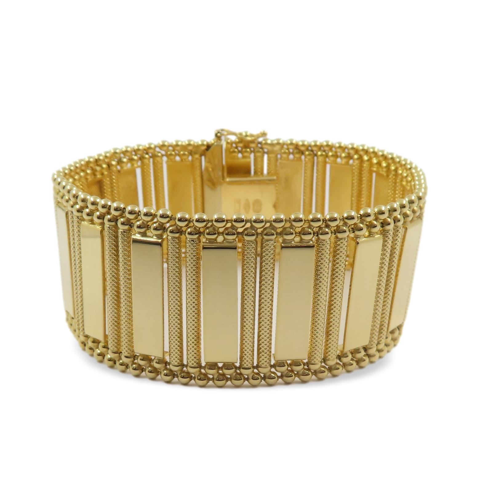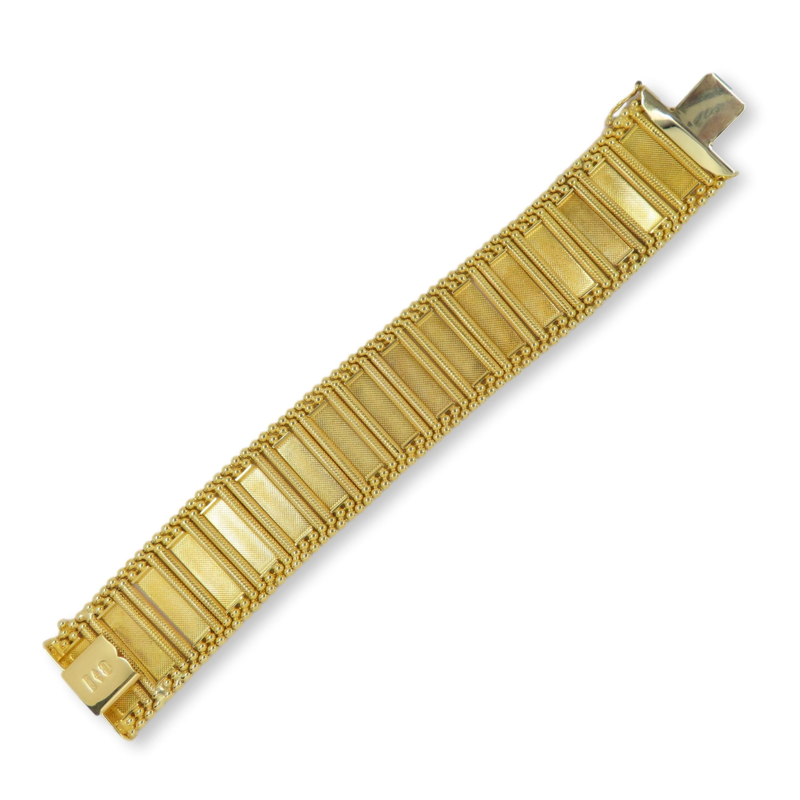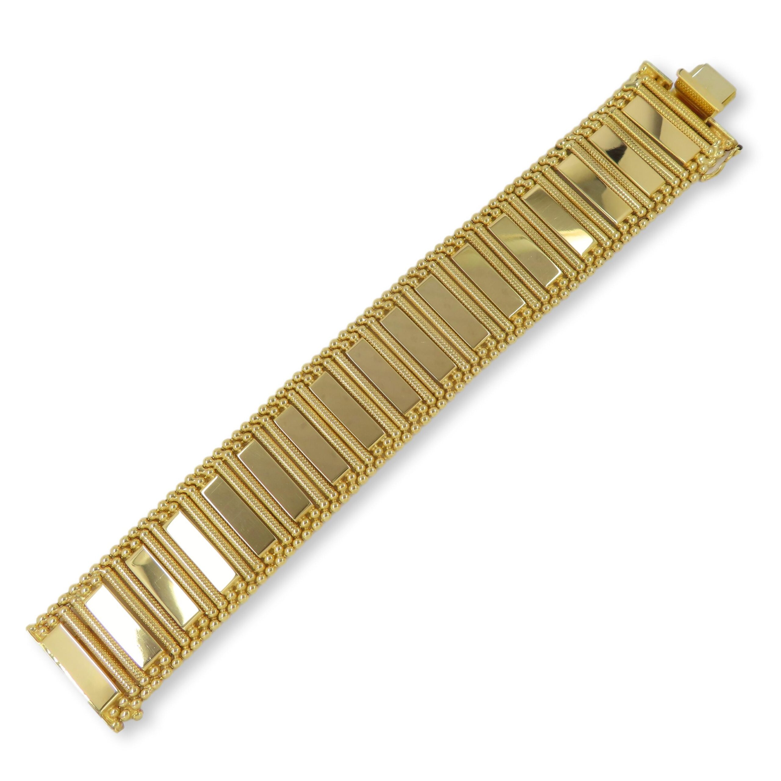 A stylish vintage Italian gold strap bracelet by Unoaerre of Arrezo, Italy. Formed of a series of beautifully highly polished rectangular plaques and textured cylindrical baton links, with spherical detailing to the bracelet edge. Expertly hand crafted throughout in 18 carat yellow gold, and dating to circa 1970.